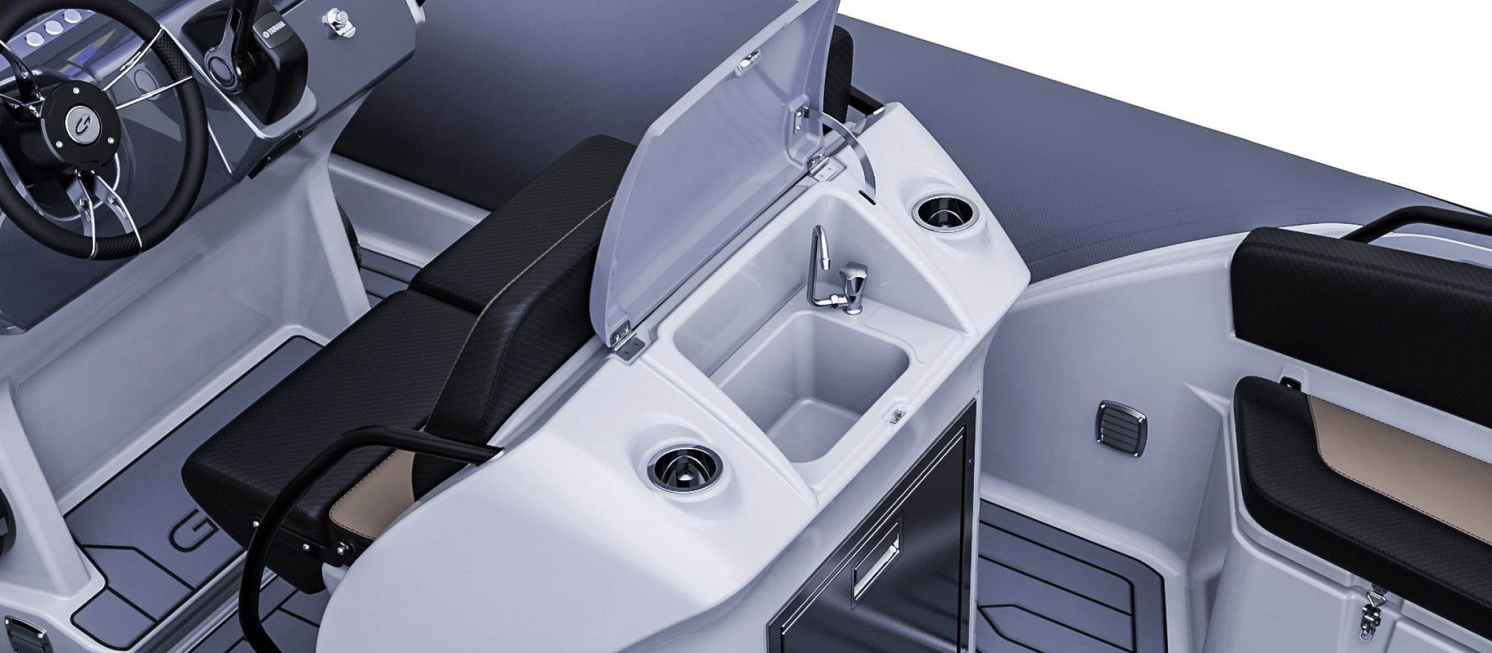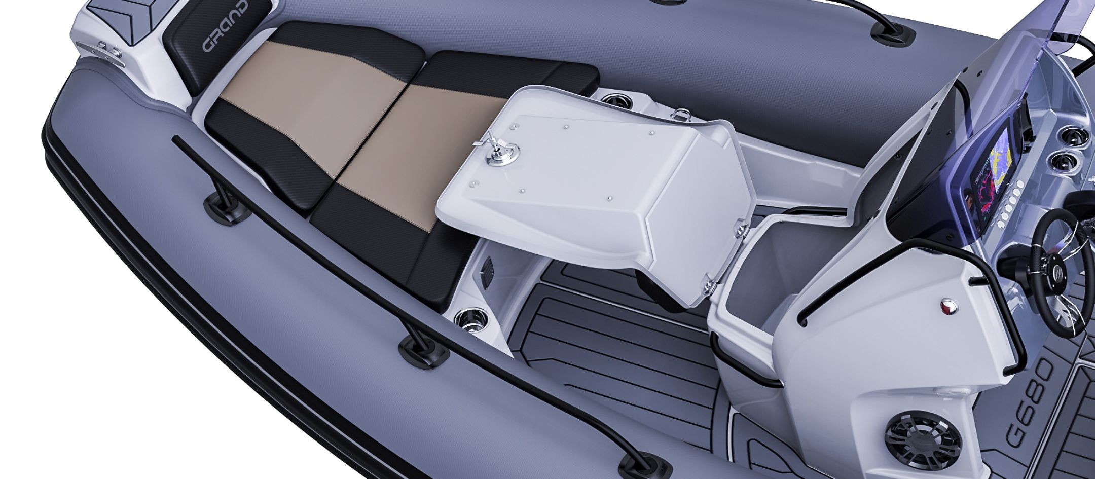 Ombord i Grand 680 Golden Line finner du praktiske løsninger som gjør båtlivet enklere. Båten er utstyrt med gode sitteplasser, smarte lagringsrom og en ergonomisk førerplass som gir god oversikt.