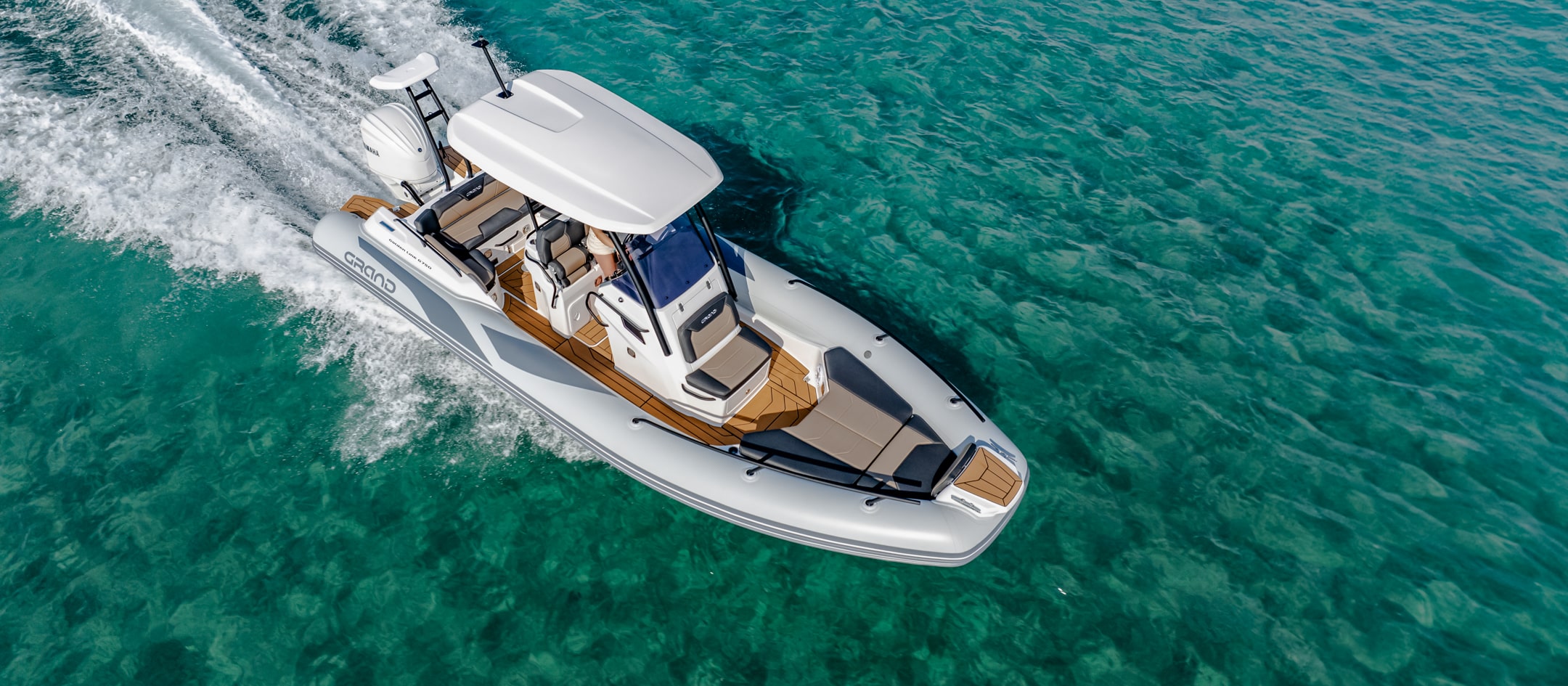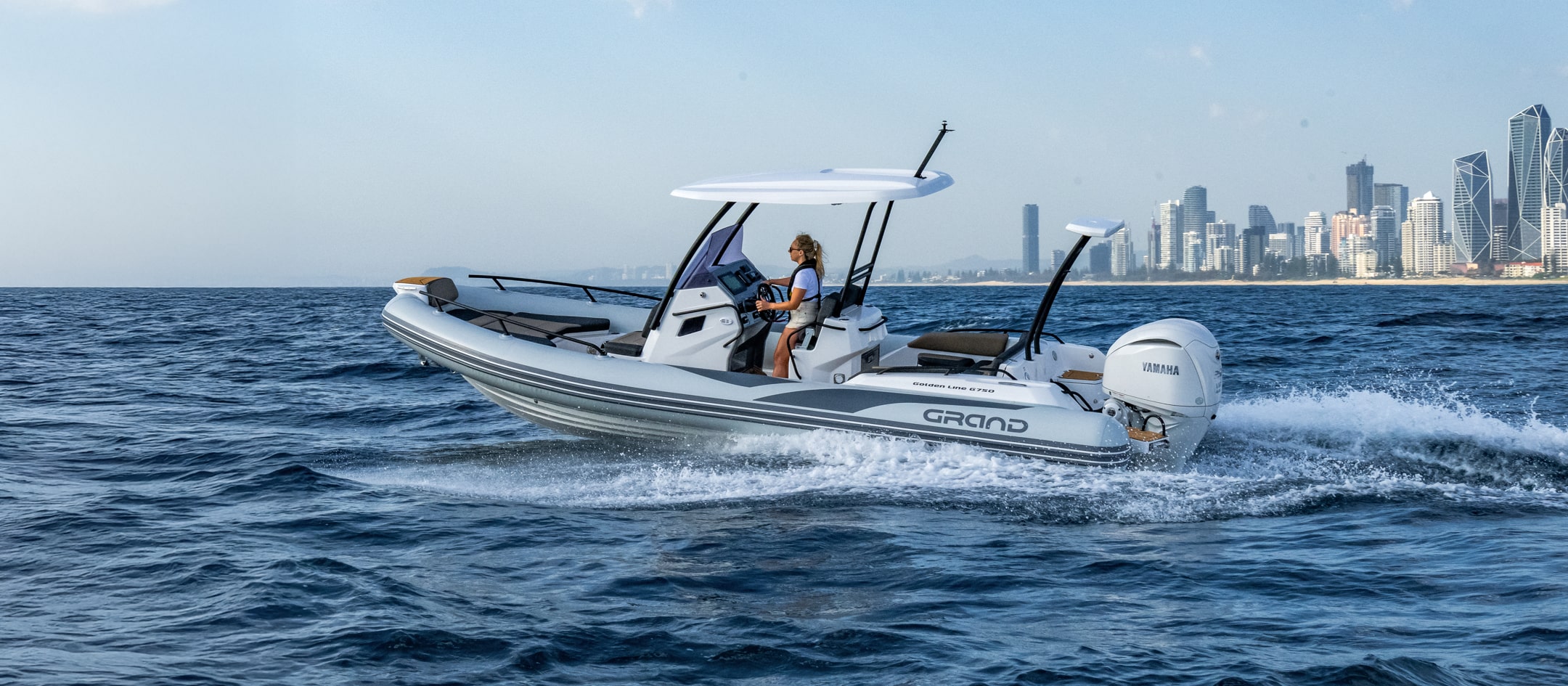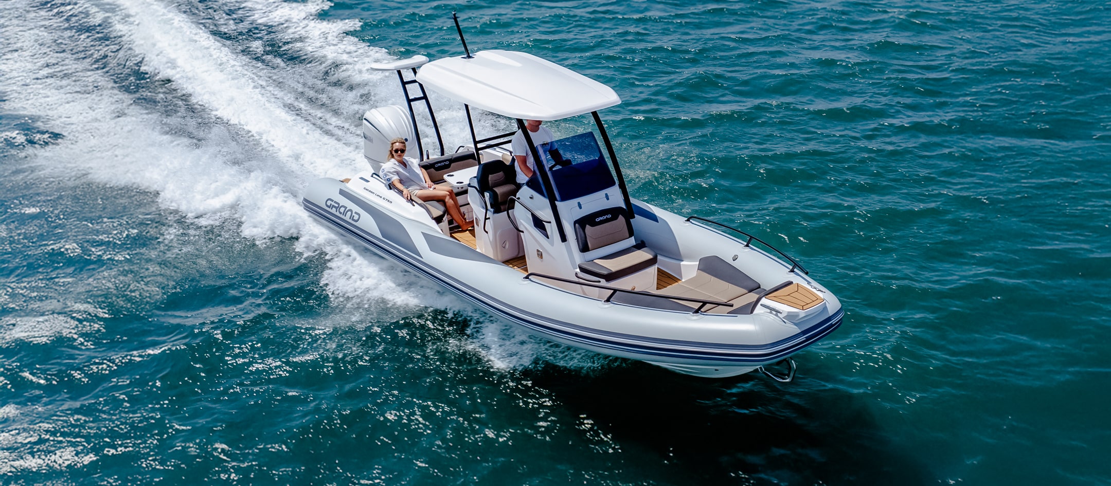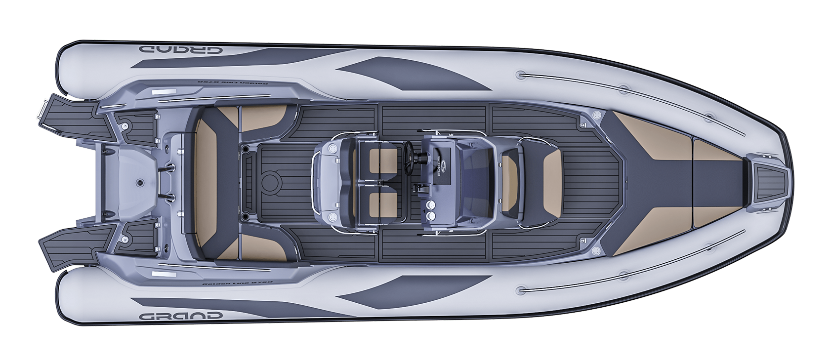 Grand 750 Golden Line kombinerer et solid glassfiberskrog med slitesterke Hypalon-slanger. Dette gir svært god stabilitet og en myk gange i bølger. Skroget er optimalisert for effektiv fremdrift og trygg håndtering i variert sjø.