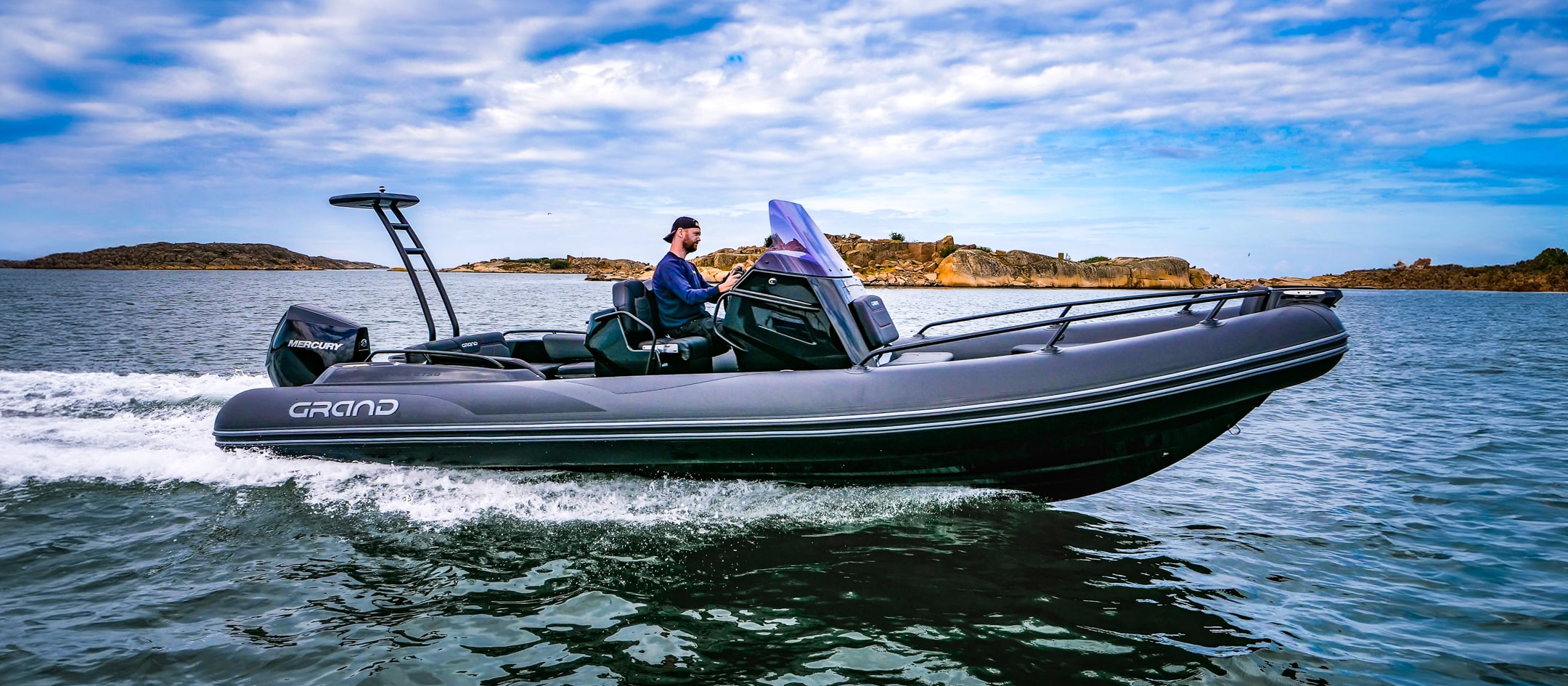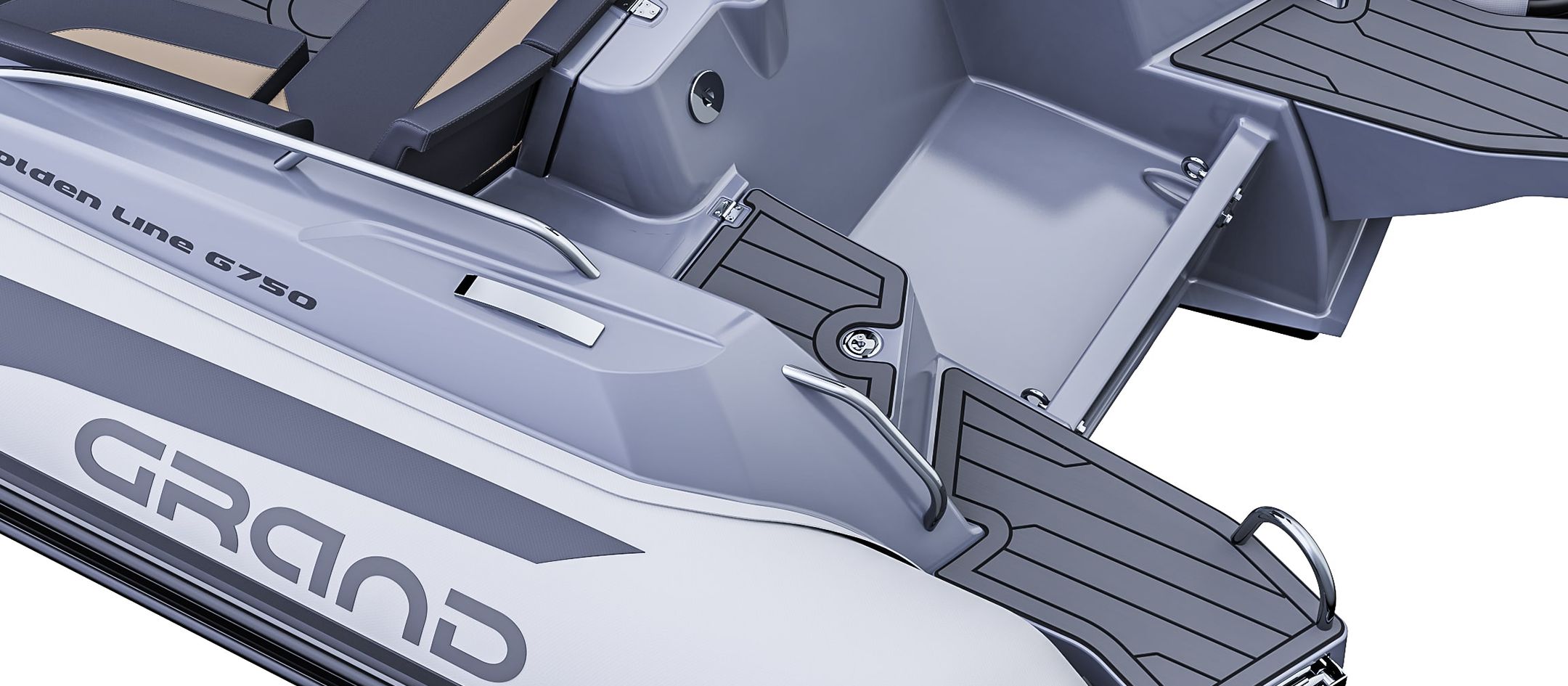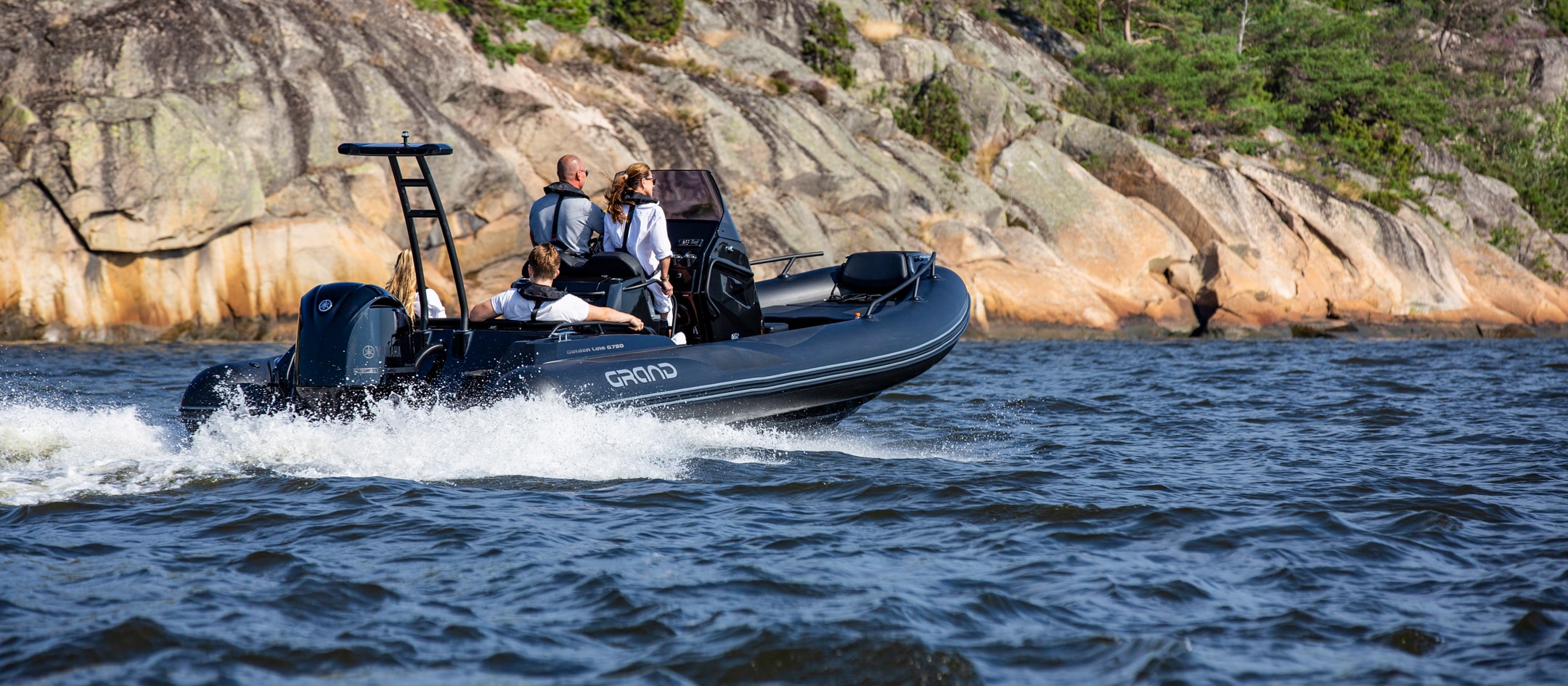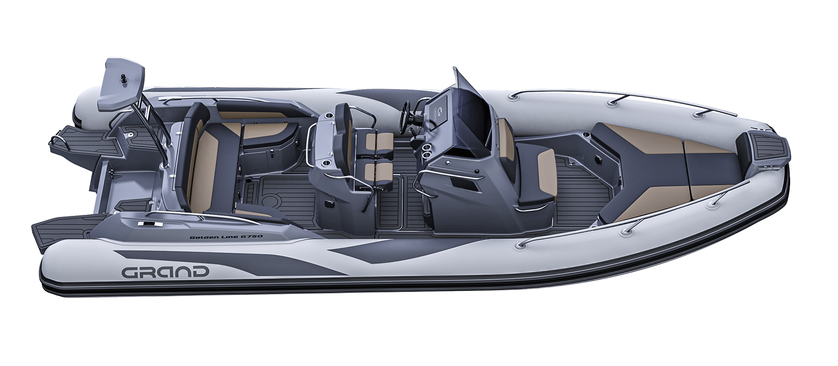 Grand 750 Golden Line er en moderne RIB-båt utviklet for norske forhold, med fokus på trygghet, brukervennlighet og gode sjøegenskaper. Grand 750 Golden Line egner seg godt til både familiebruk, transport og fritid på sjøen.