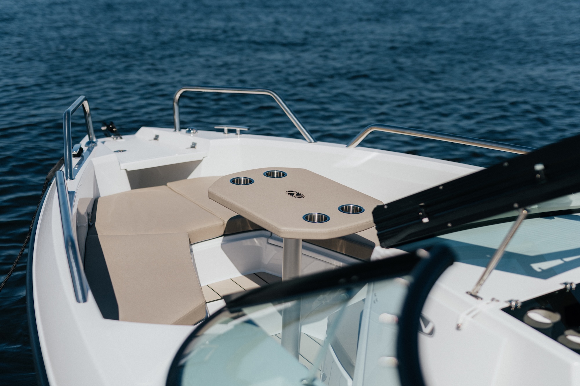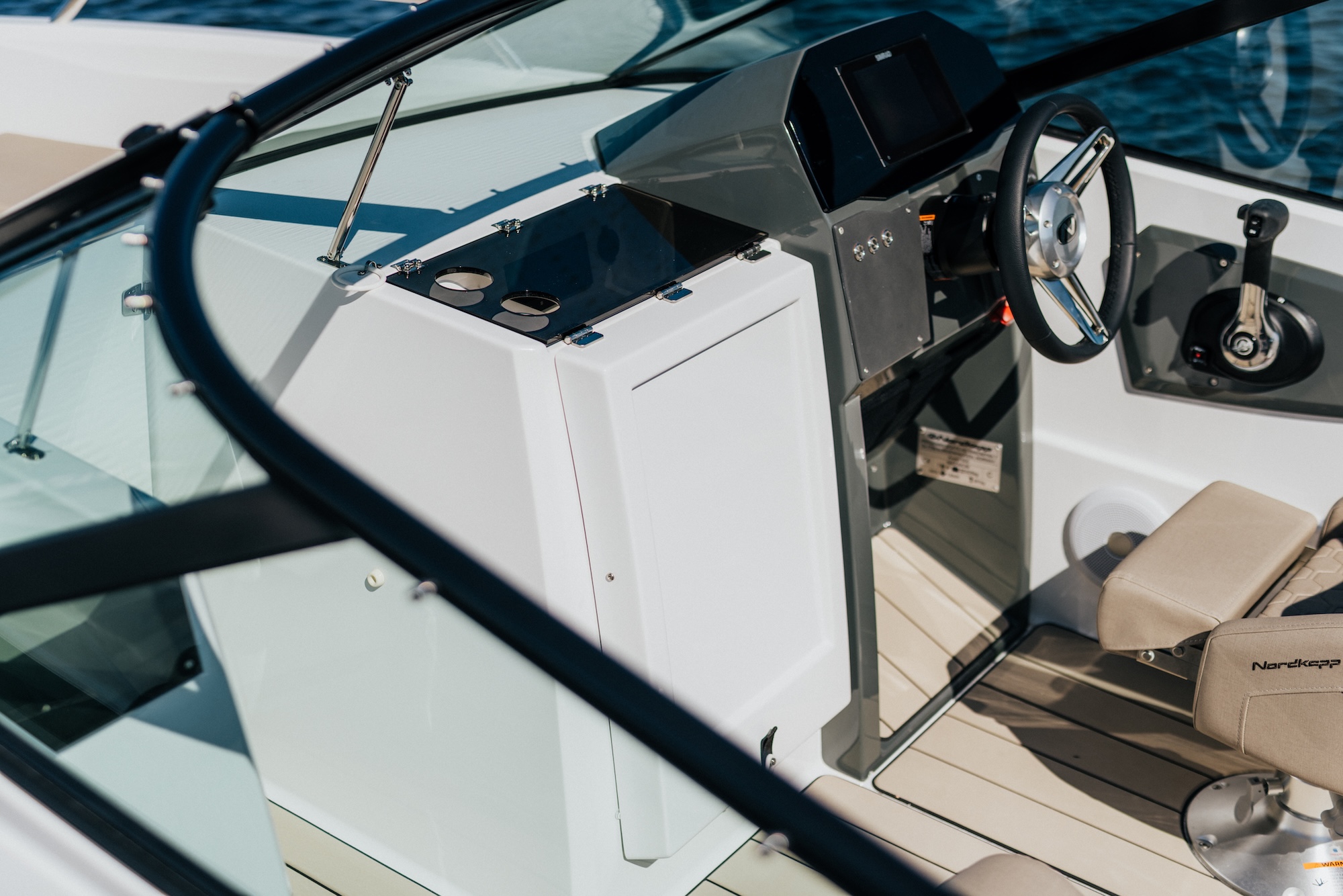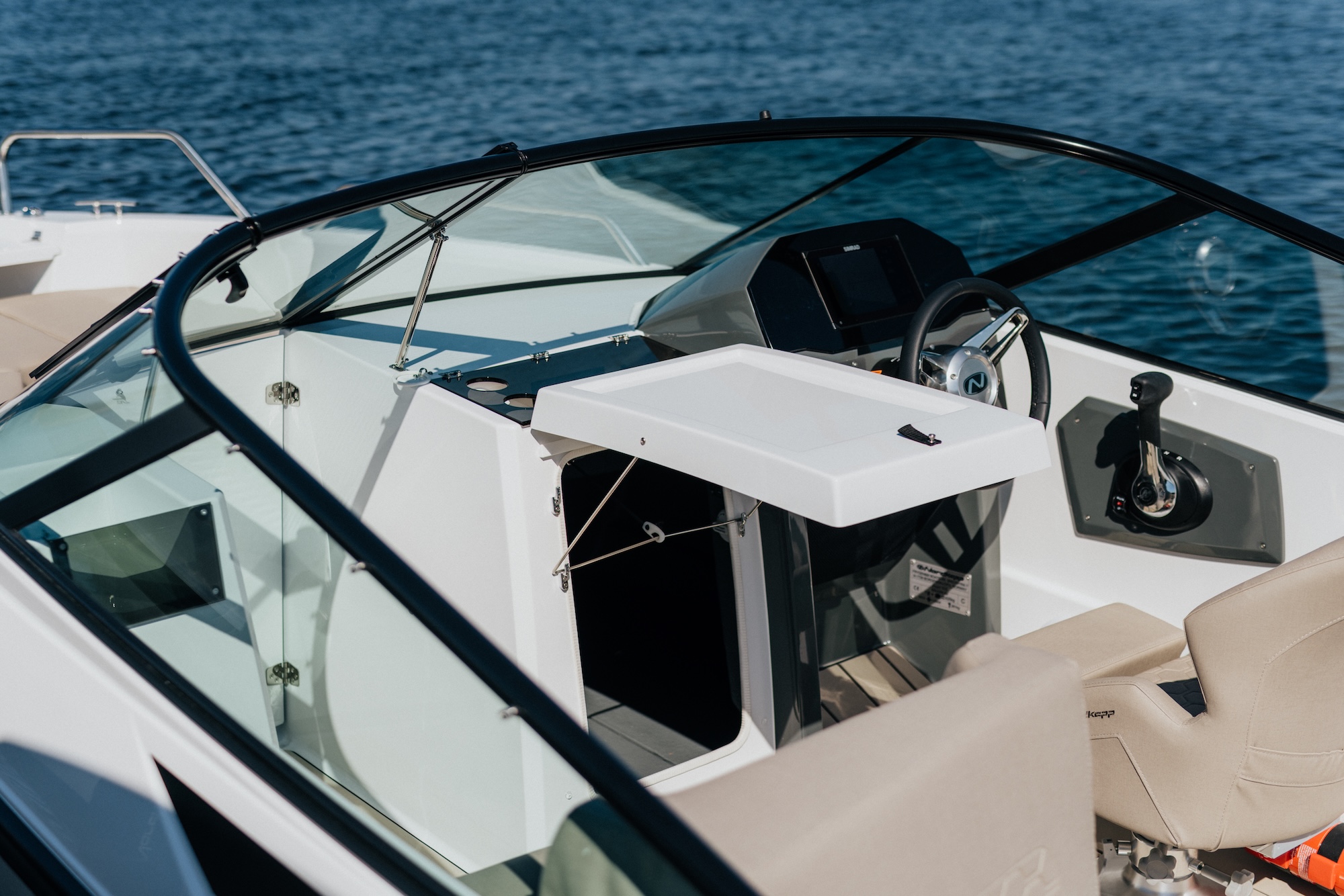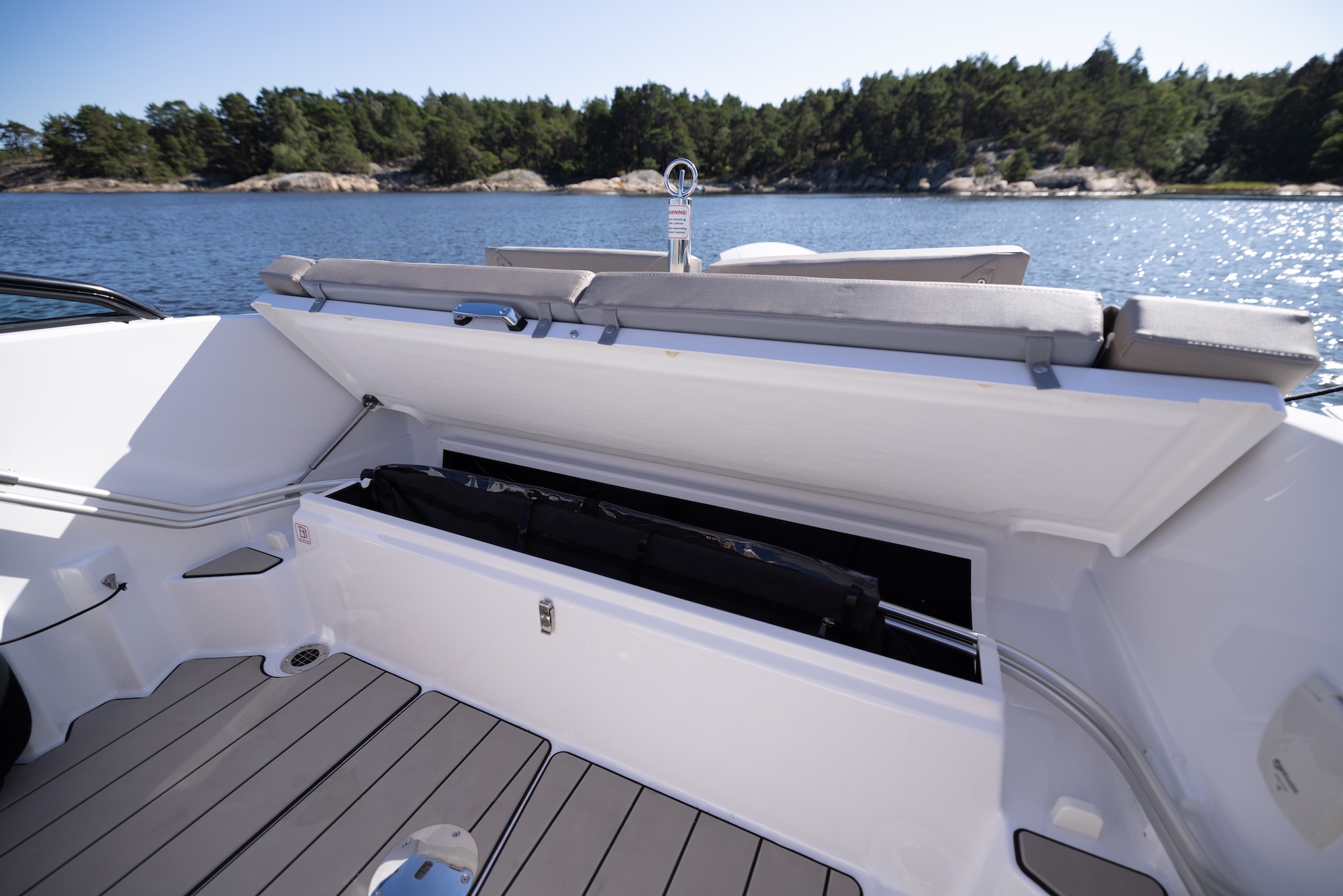 En smart detalj er luken til stuerommet i konsollen, som også kan fungere som et stabilt cockpitbord. Dette gjør båten ekstra praktisk når dere ønsker å spise eller samle dere rundt bordet under turen.