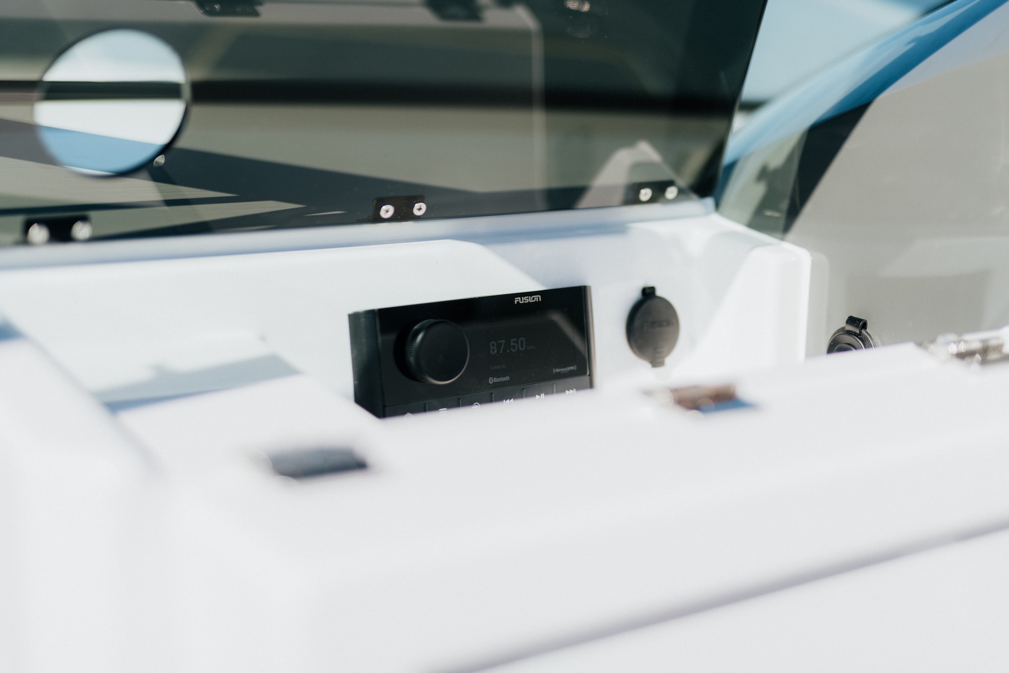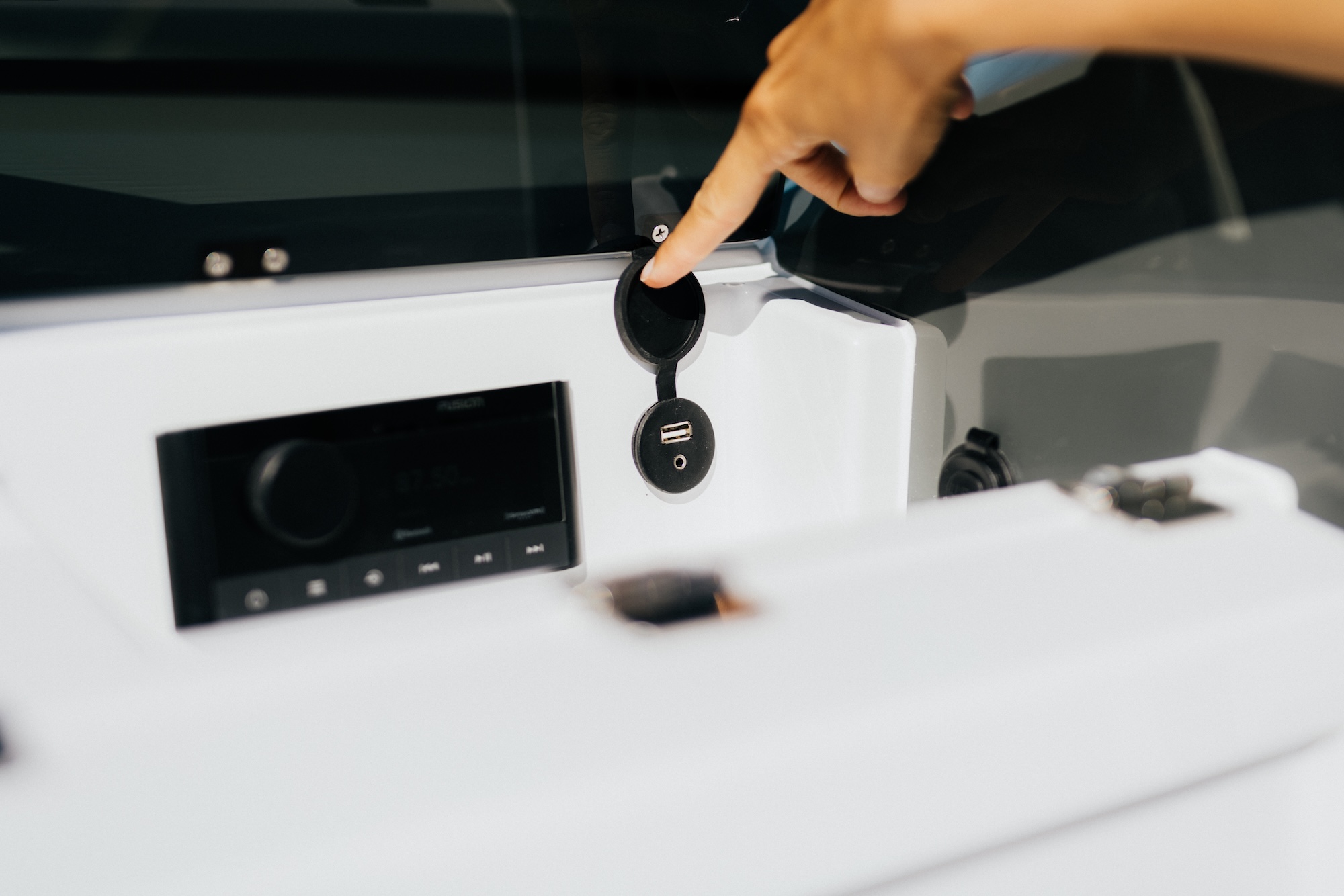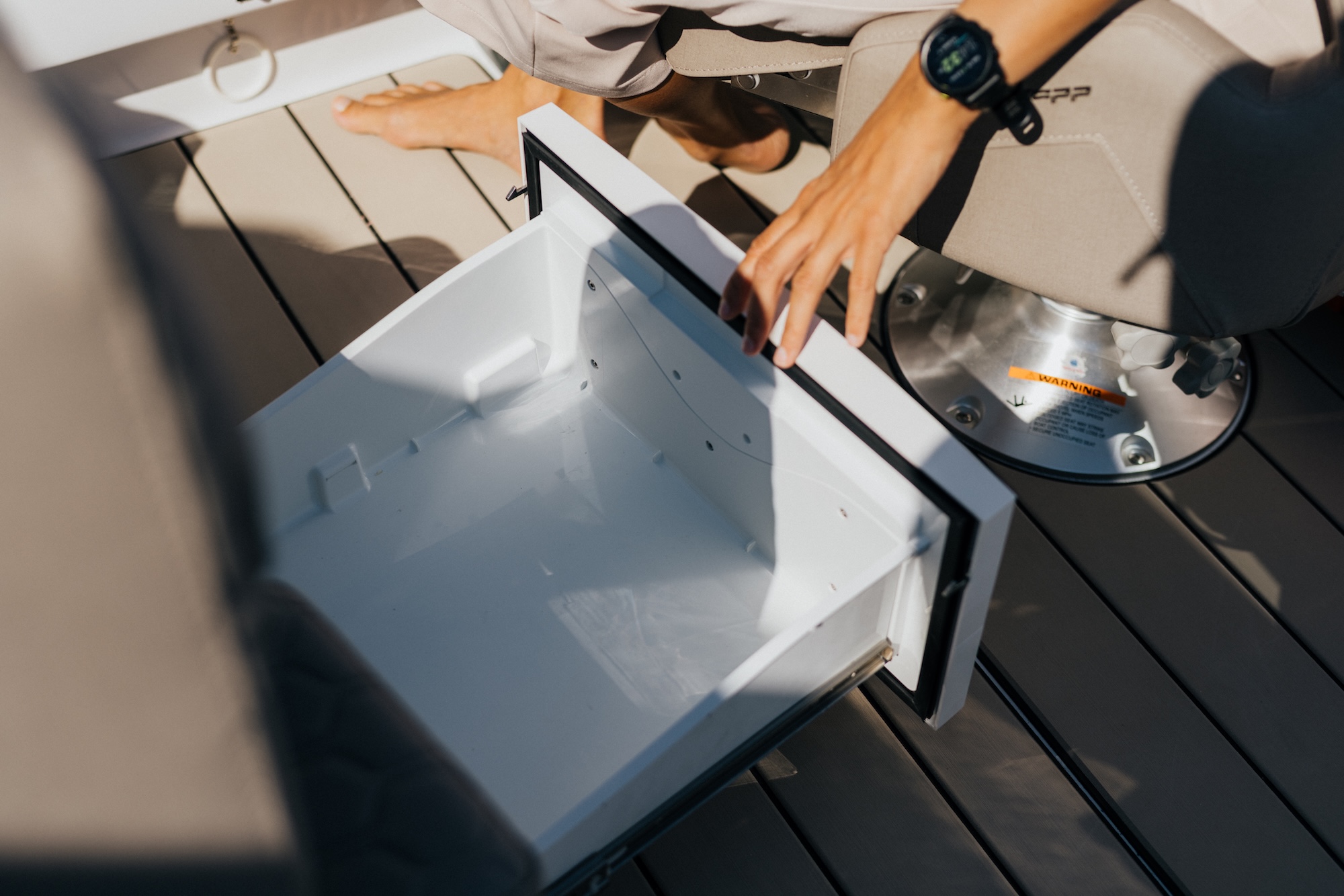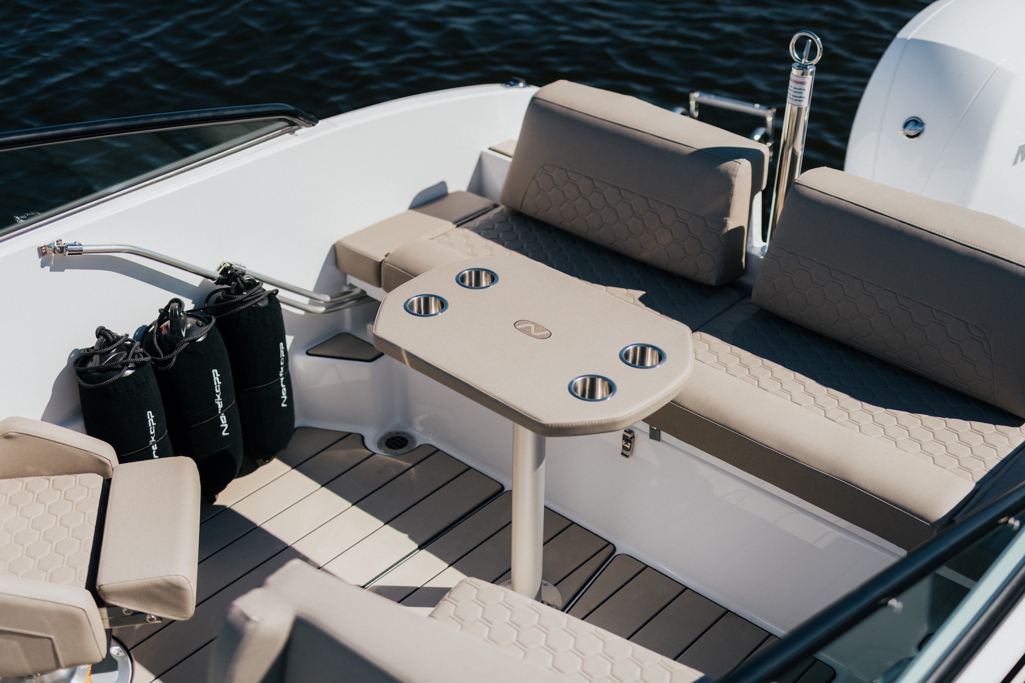 En smart detalj er luken til stuerommet i konsollen, som også kan fungere som et stabilt cockpitbord. Dette gjør båten ekstra praktisk når dere ønsker å spise eller samle dere rundt bordet under turen.