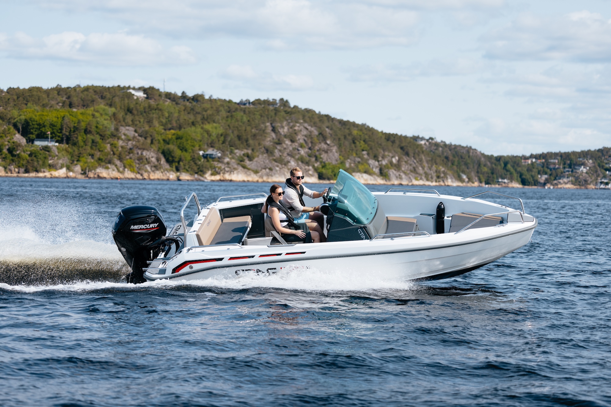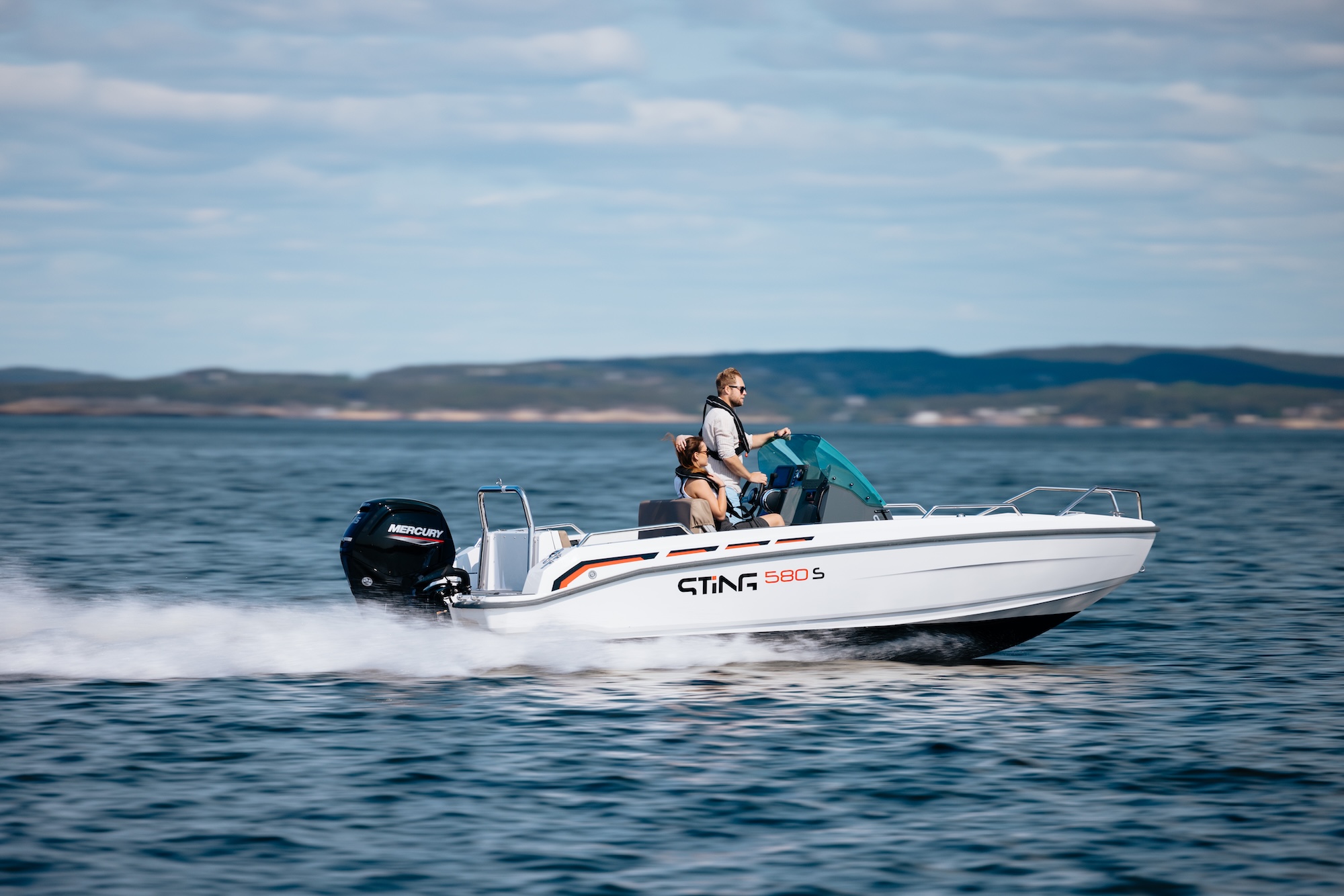 Du kan velge mellom stillegående og kraftige Mercury-motorer på 100 eller 115 hk. Ønsker du ekstra kraft og sporty kjøreglede, anbefales Mercury 115 Pro XS. Kombinasjonen av bredt skrog og lavt tyngdepunkt gir stabile og sikre sjøegenskaper, også i røffere forhold.