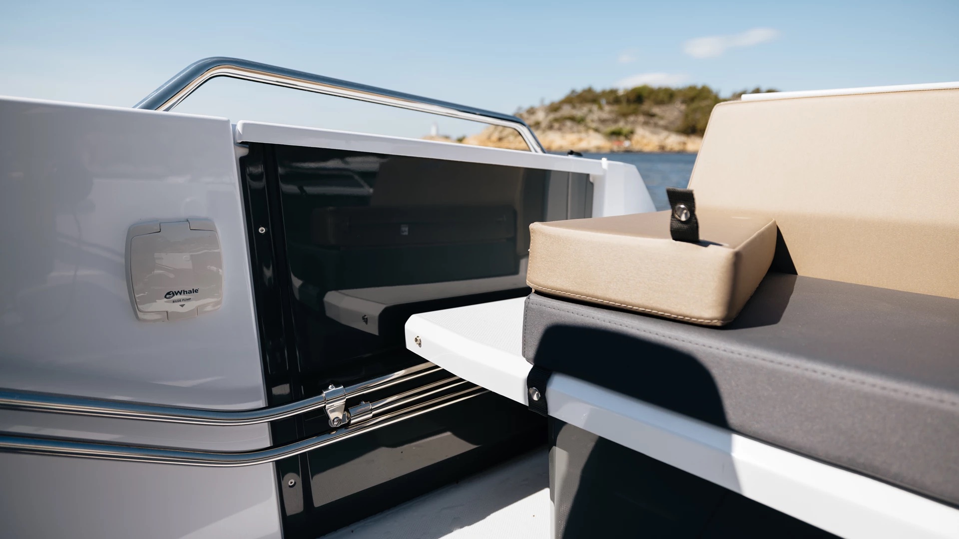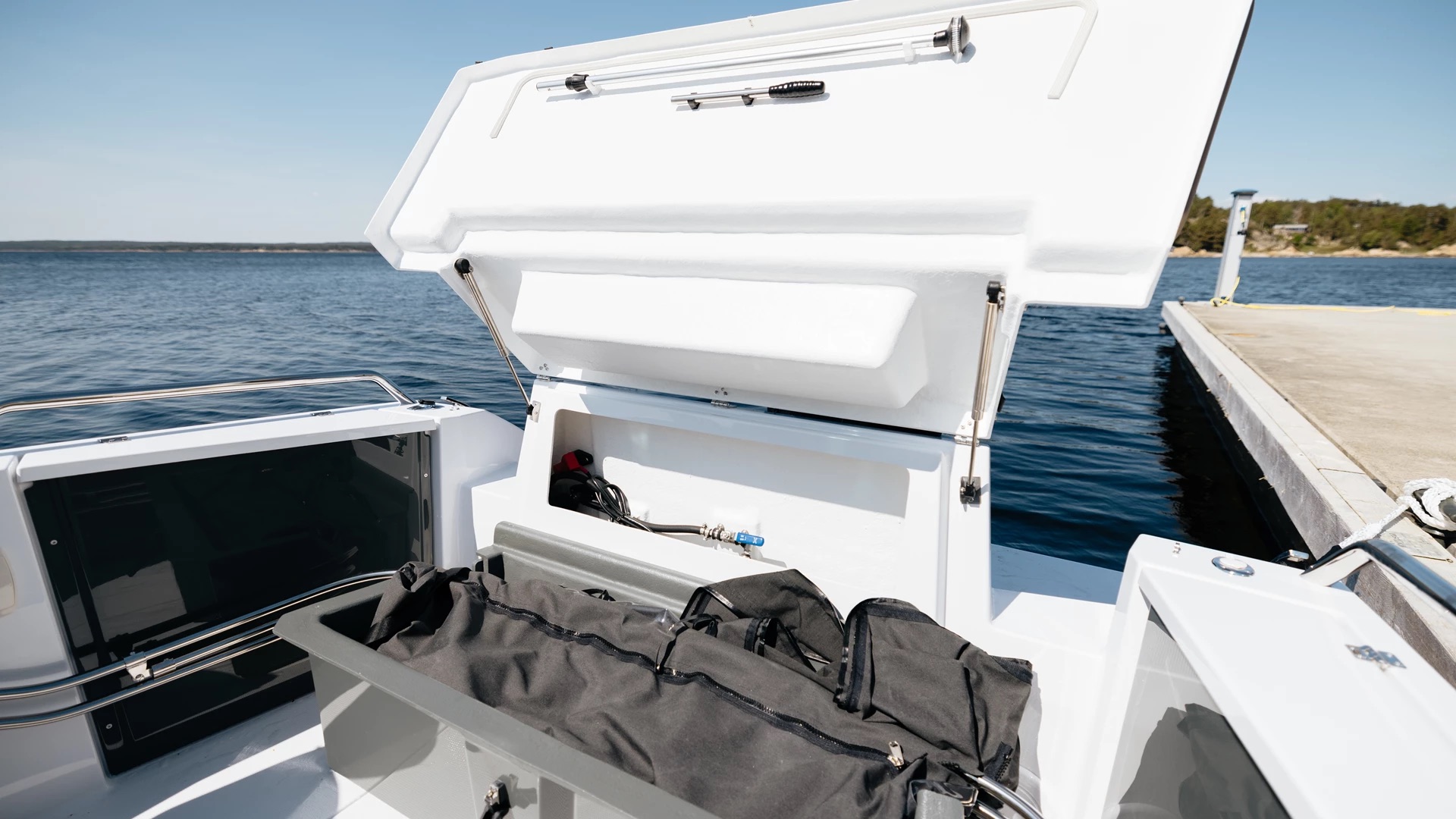 En stor solseng i baugen gir deg muligheten til å nyte solen i ro og fred, med integrerte koppholdere og god lagringsplass under dekk. Praktiske trappetrinn i skrogsiden gjør det enkelt å gå i land – selv med solsengen montert. Akterdekket har plass til cockpitbord og servering, og store badeplattformer gjør bading både trygt og behagelig for hele familien.